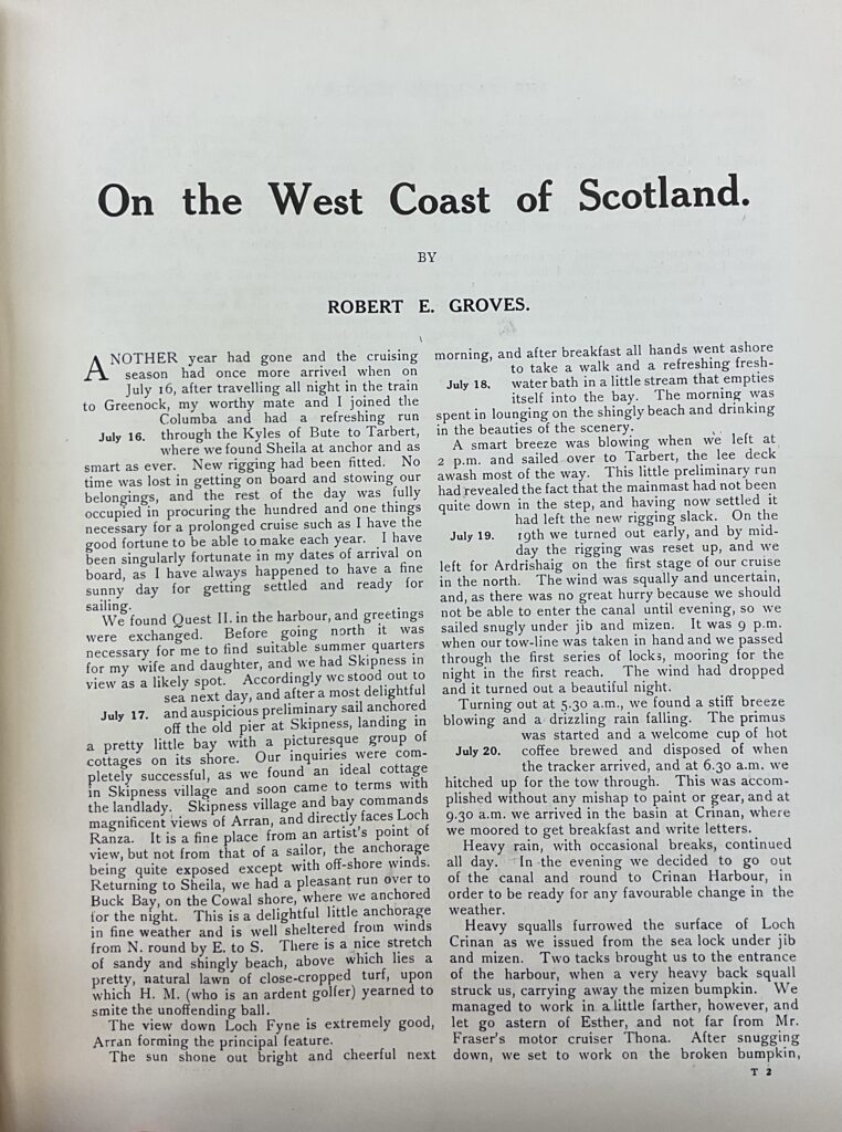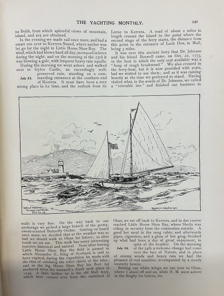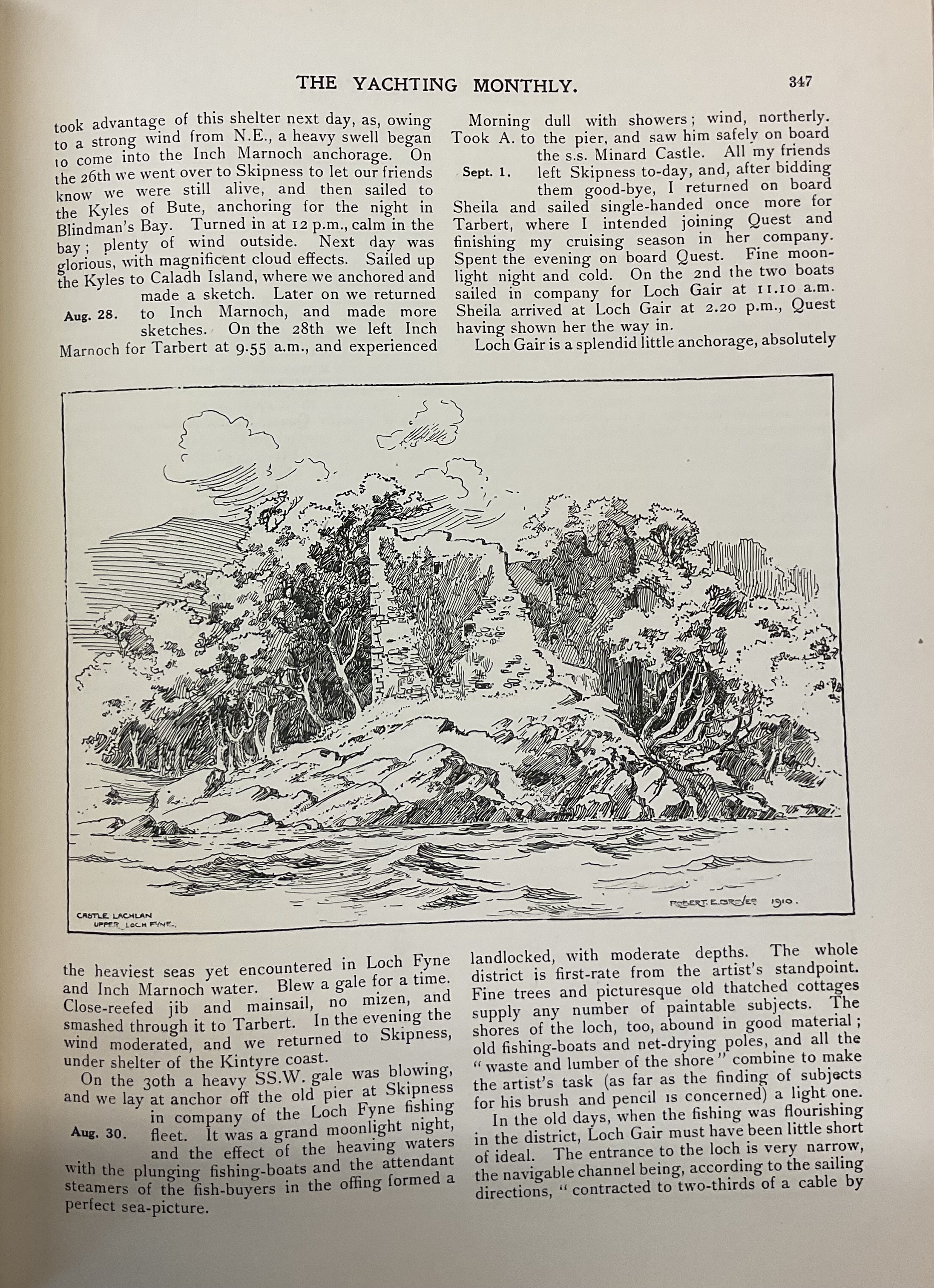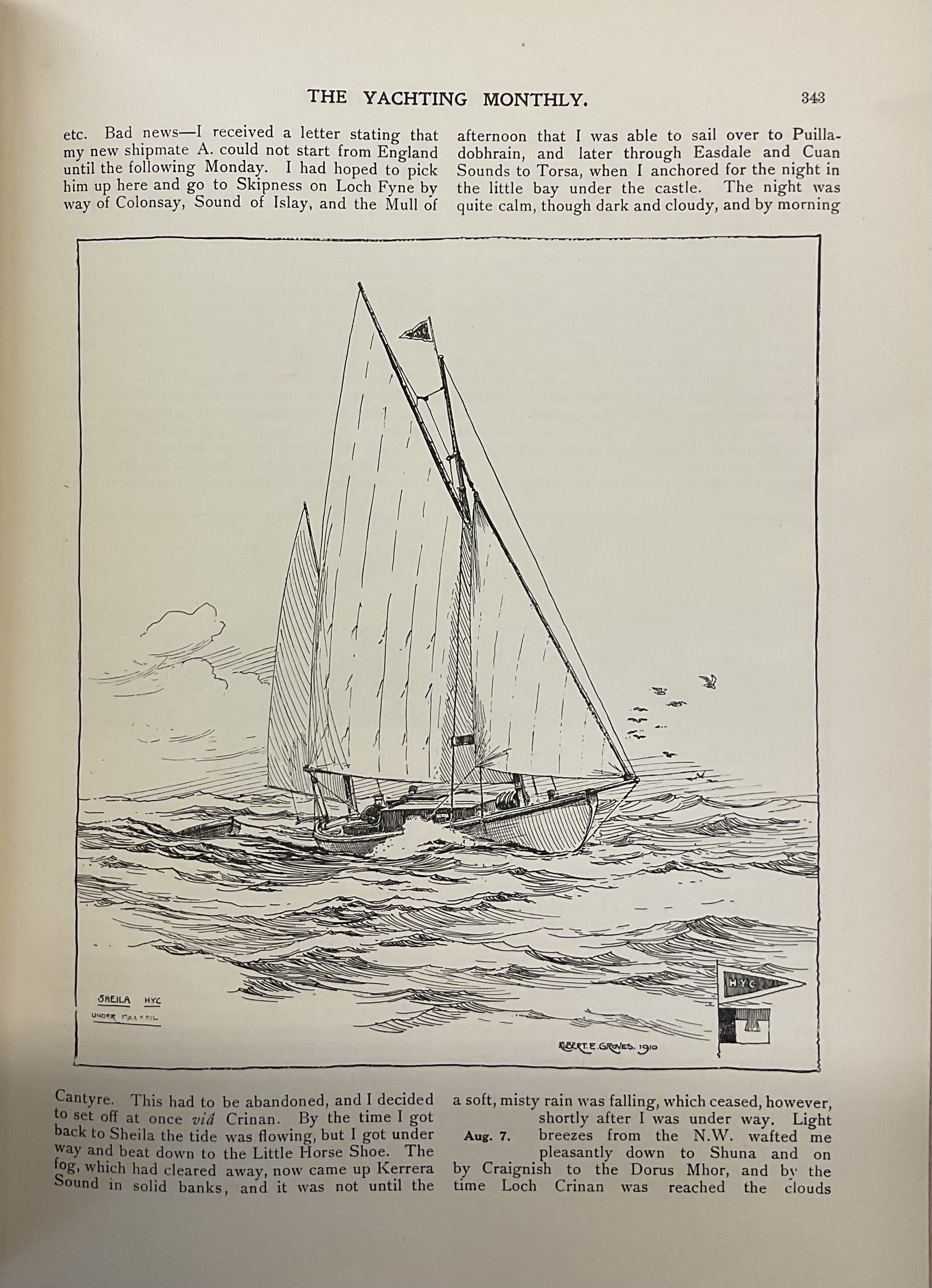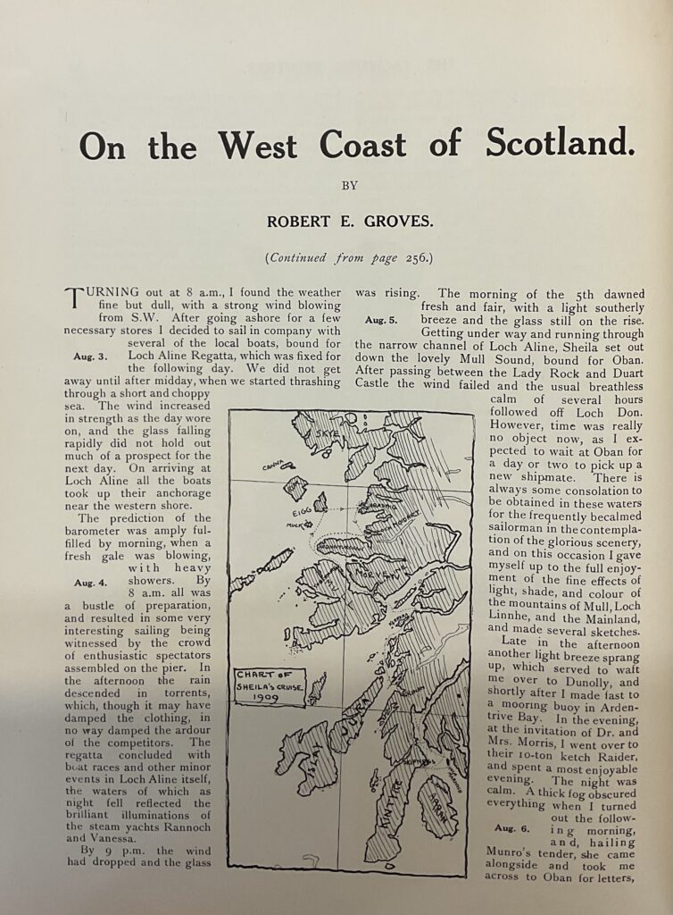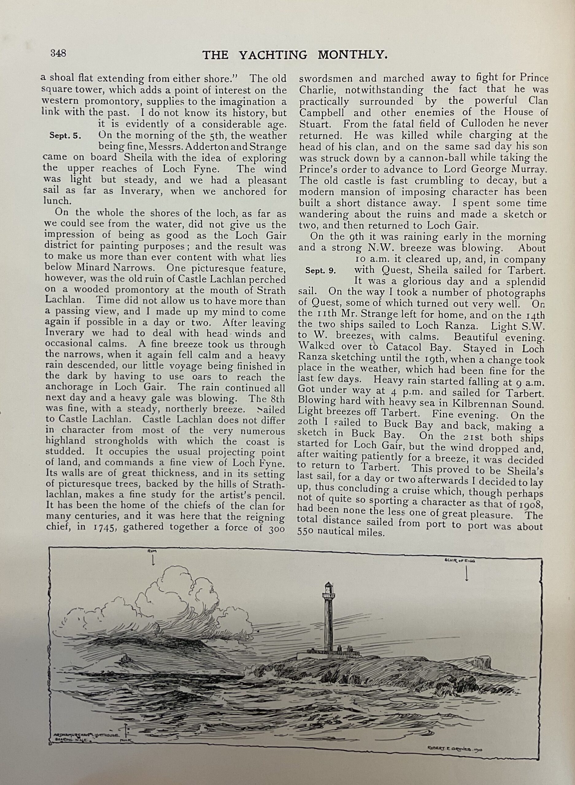 “The cruise of 1909 was not nearly so sporting in character as that of the previous season when Stornoway was reached and many other romantic and far-distant spots were visited, more than half of the time being spent in the waters of Loch Fyne. The weather on the whole was good, very good as compared with what was experienced in England; and though the time spent north of Crinan was only eighteen days, several fresh and highly interesting anchorages were added to Sheila’s list.