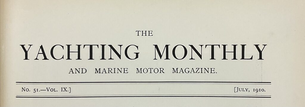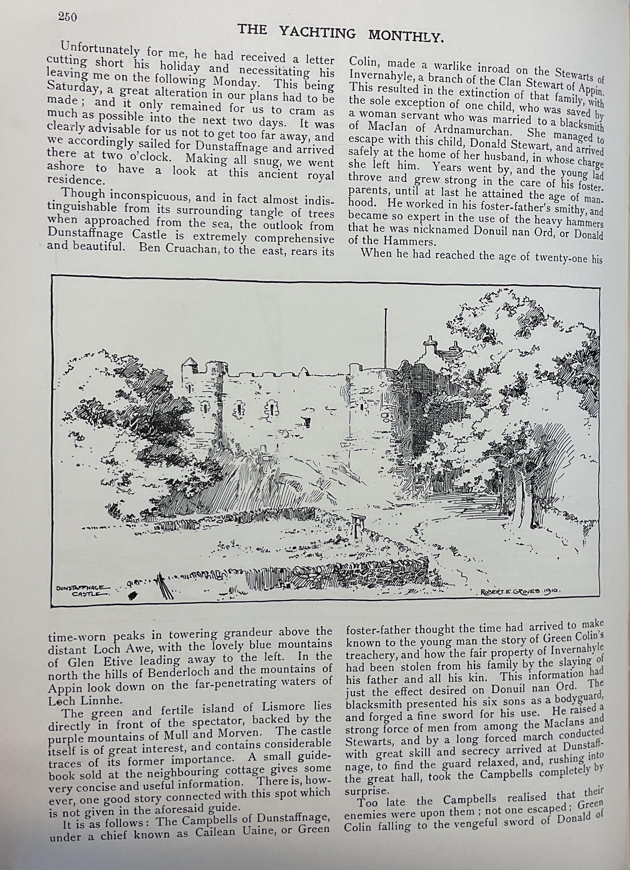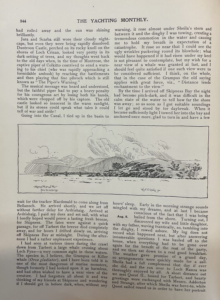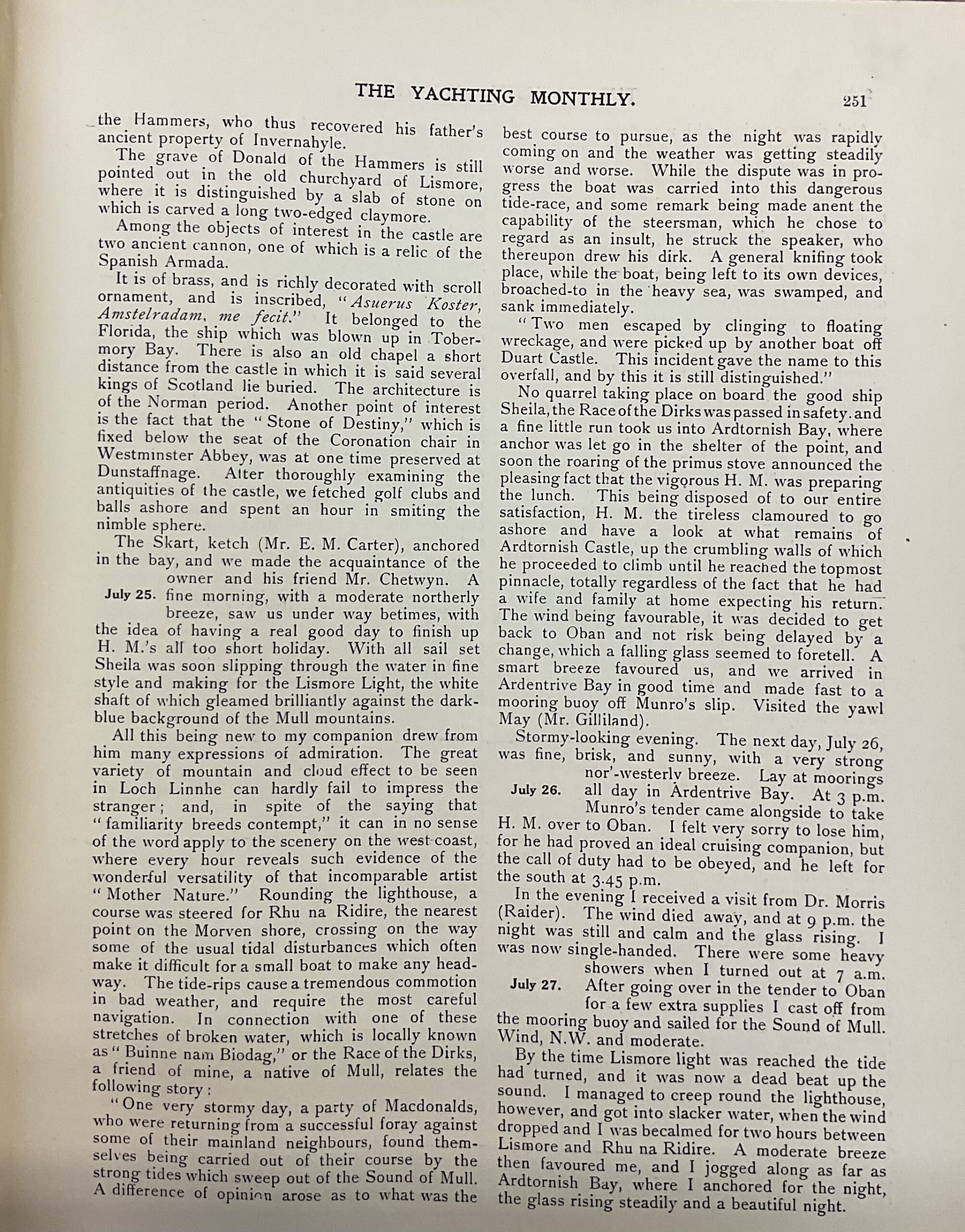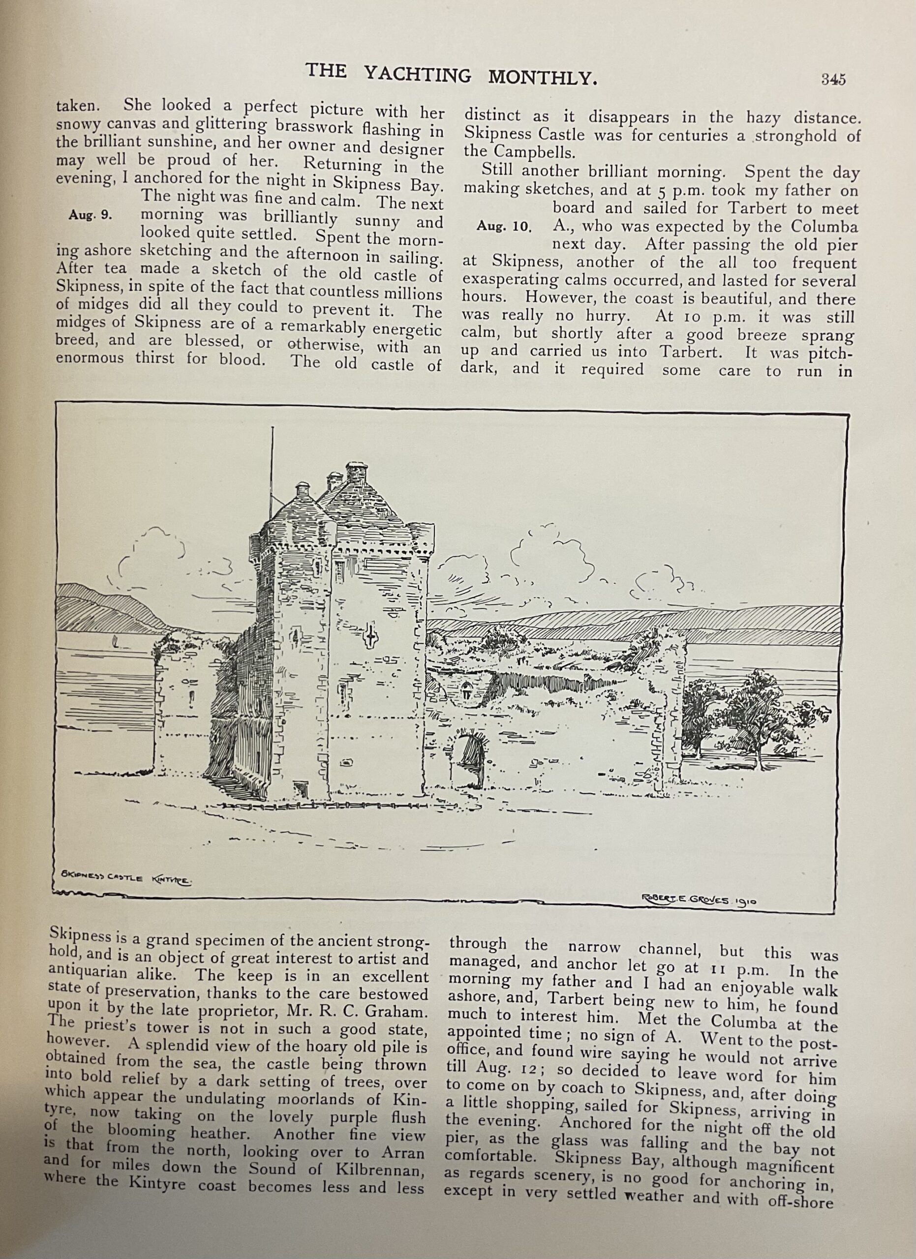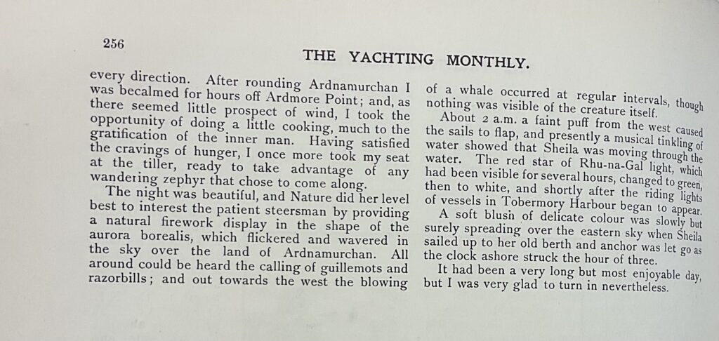 “The cruise of 1909 was not nearly so sporting in character as that of the previous season when Stornoway was reached and many other romantic and far-distant spots were visited, more than half of the time being spent in the waters of Loch Fyne. The weather on the whole was good, very good as compared with what was experienced in England; and though the time spent north of Crinan was only eighteen days, several fresh and highly interesting anchorages were added to Sheila’s list.
