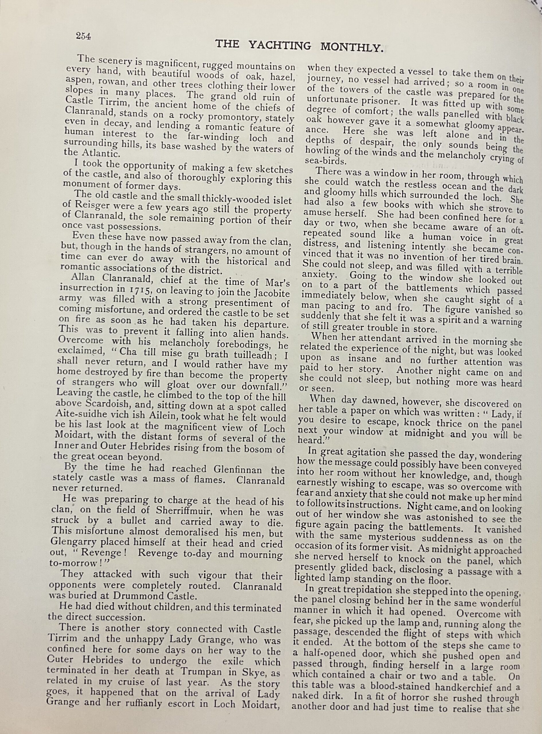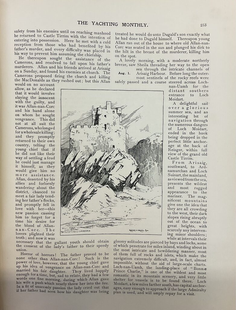 1st August—Left Arisaig and sailed along that magnificent stretch of mountainous coast which lies between that spot and Ardnamurchan point. Went into the wild and romantic Loch Moidart and anchored close to Castle Tirrim, the ancient home of the Clanranalds. Made a few sketches of the ruins, and explored the island of Reisger. Lovely moonlight night. Left next morn- ing for Tobermory. Wind very light. Becalmed for hours off Ardmore and an- chored at Tobermory at 3 a.m., after a long and latterly rather monotonous sail. Left Tobermory in the morning in company with a number of local boats bound for Loch Aline to take part in the Regatta. Stiff breeze; glass falling.