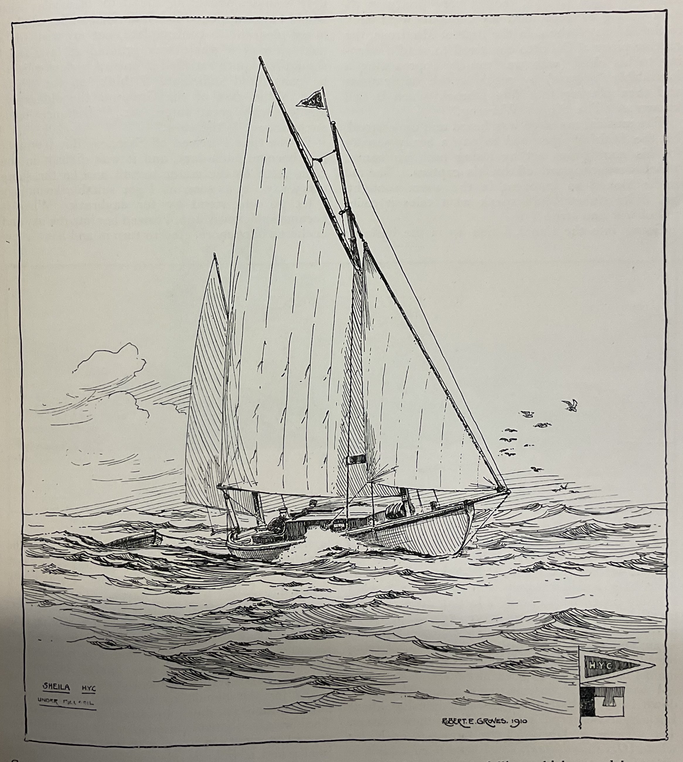 Robert Groves sailed Sheila for 2 Summer months. The first week, he was sailing with a friend, then single-handed. He spent time sketching, including with fellow artists Albert Strange and C. W. Adderton as Sheila and Quest II were sailing together. Quest II is design #80 by Albert Strange, built for Adderton in 1907. She was a 44’ gaff ketch with a canoe counter hull. She was built in Talbert.