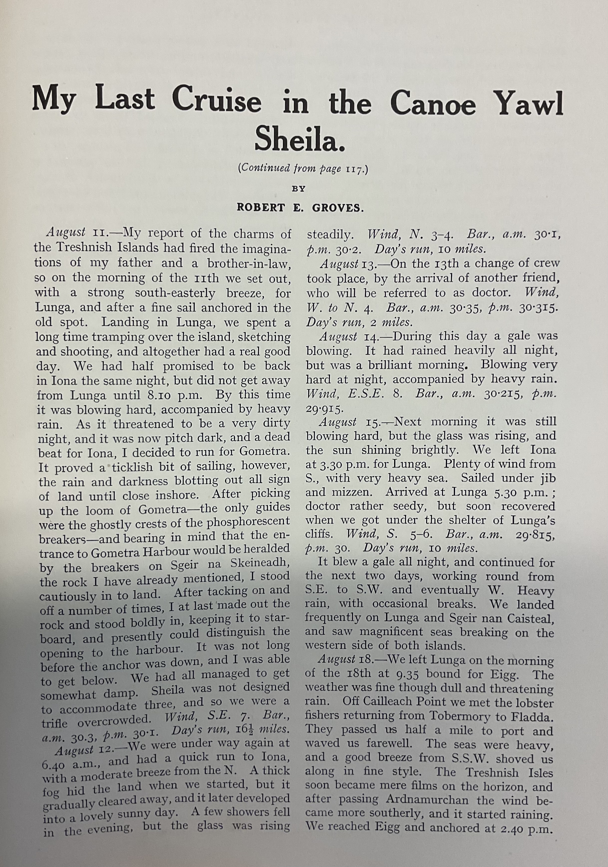 Originally published in ‘Yachting Monthly’, May 1933, this extract is from a series of articles by Robert E. Groves, regular contributor to the Magazine, yachtsman, soldier and artist. He recalls a most enjoyable sail to the Shiant Islands in perfect weather conditions across the challenging waters of the Minch around 1910. Robert E. Groves sails single-handed in ‘Sheila I’, the little yawl of four tons built for him at Port St. Mary from the design by Albert Strange. She’s a fine seaboat, as was often proved on many a strenuous cruise in the wild waters on the west coast of Scotland. Here he paints a beautiful picture of the wildlife and dramatic cliffs of the Shiant Islands, off Lewis.