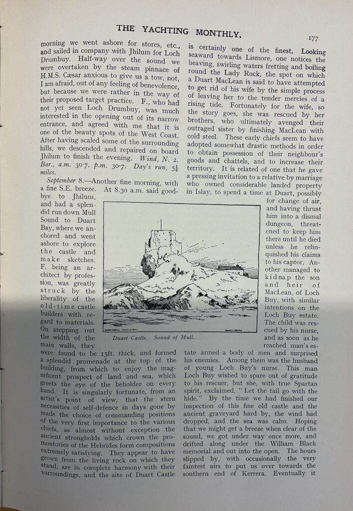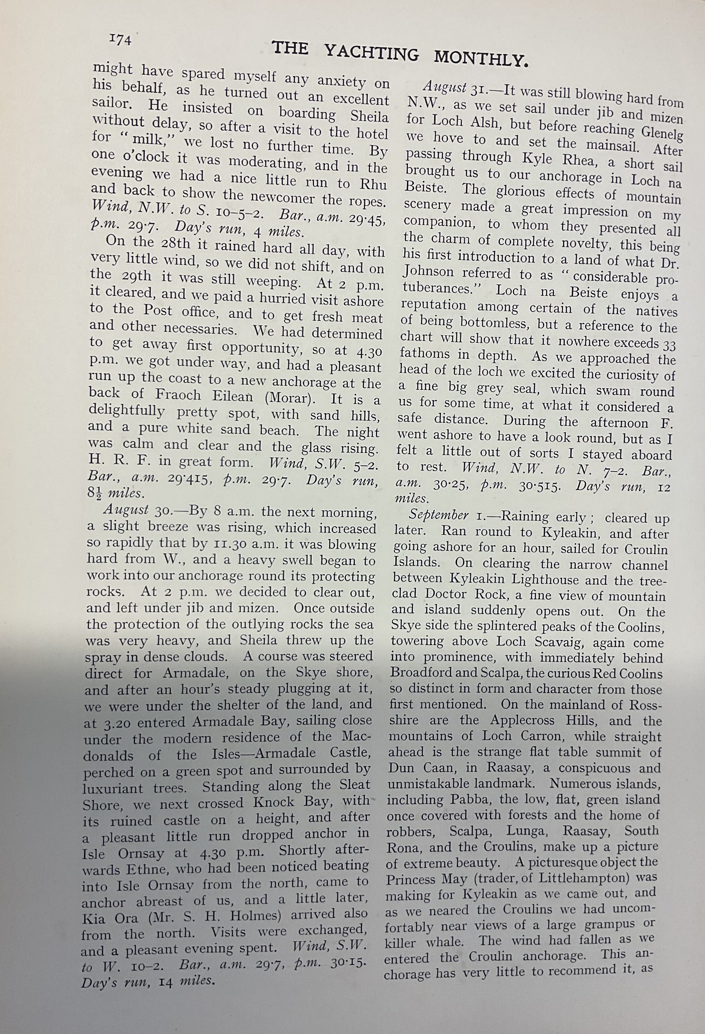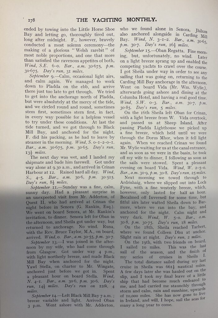 The passage through the Minch is dangerous in places on account of the strong tidal currents and numerous overfalls. As a matter of fact, nearly all that portion of the Little Minch which lies in a line between the north of Skye and Tarbert, Harris, is better avoided, except in really good weather; although when known, or under the pilotage of a man with local knowledge, the dangers, like a good many others on the much-maligned coasts of the Hebrides, are not nearly so bad as the Sailing Directions would imply. Still, caution is necessary! By 9 o’clock we were abreast of Sgeir Inoe, and ‘Sheila’ was walking along in grand style, with a breeze just sufficient to put her lee rail under. The mountain views of Harris on the one hand and of Skye on the other were magnificent: the glorious blue of the Minch, flecked with white crests, a feast for the eyes. Astern, the long, creamy wake testified to the speed we were making.