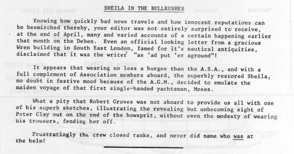 The design of the rig, as conceived, display his views well. Simplicity is the keynote and yet it is surprisingly close winded, ably abetted by the hull which performs well when pressed close. Many people comment upon his use of sloop rig where the more fashionable cutter predominated and his fitting out his rig without a stemhead forestay. Strange knew exactly what he was doing. He knew that taking off jibs on a wet, small, foredeck was dangerous and more than anything else he was aware of the capers that occur when a jib, set on a bowsprit, won’t pass reliably round a forestay. He knew from much personal experience of the dangers of these tangles and the chafe that they cause to the sail. Sheila is rigged, as were many other of his small designs, without a stemhead forestay and with a large single jib on a roller furling gear. This works superbly, and he knew that all he needed were reasonable proportions to ensure that the sprit did not carry away, and the rig with it. It has never shown any signs of so doing in 75 years and I never have to go careering onto the foredeck to clear a jammed sheet at a critical moment. The balance of this rig is such that she will carry this jib up to nearly half a gale and it is worth remarking here that this would be better if I had resisted the urge to improve on Strange. I added 18 ins. into the bowsprit and enlarged the jib, cutting it with a lower foot than shown in the original drawings. After having sailed her extensively this year I believe that Strange was right in his exact proportions and these will be returned to what was there originally. Strange knew, also, that if his rig was to perform well under jib and mizzen then both these sails had to be real and not jokes. His improvement of the Humber Yawl by the addition of a jib retained the size of the original mizzen, of which he was a constant advocate. He must have known well the pleasure of watching from the comfort of his cosy cockpit with his main safety in its crutch, all the other boats being flattened in a gale with their single masted rigs, and he peaceful with the boat well under control.
