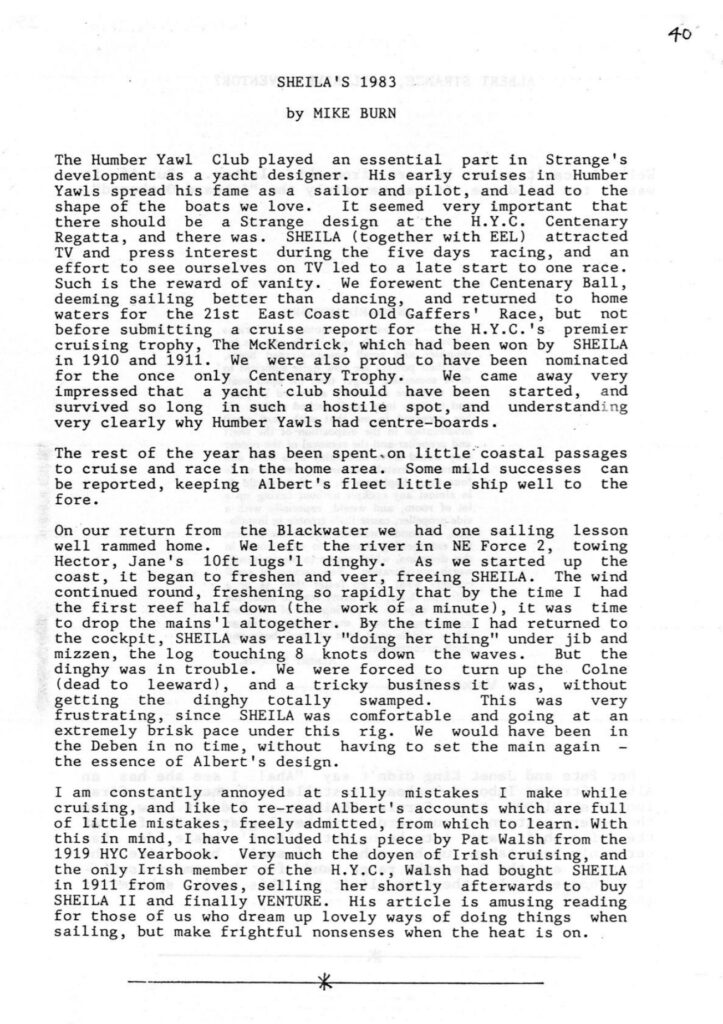 Sheila is moored alongside Eel, a famous Holmes design, in Broogh Haven. Both Albert Strange and George Holmes were members of the Club.
